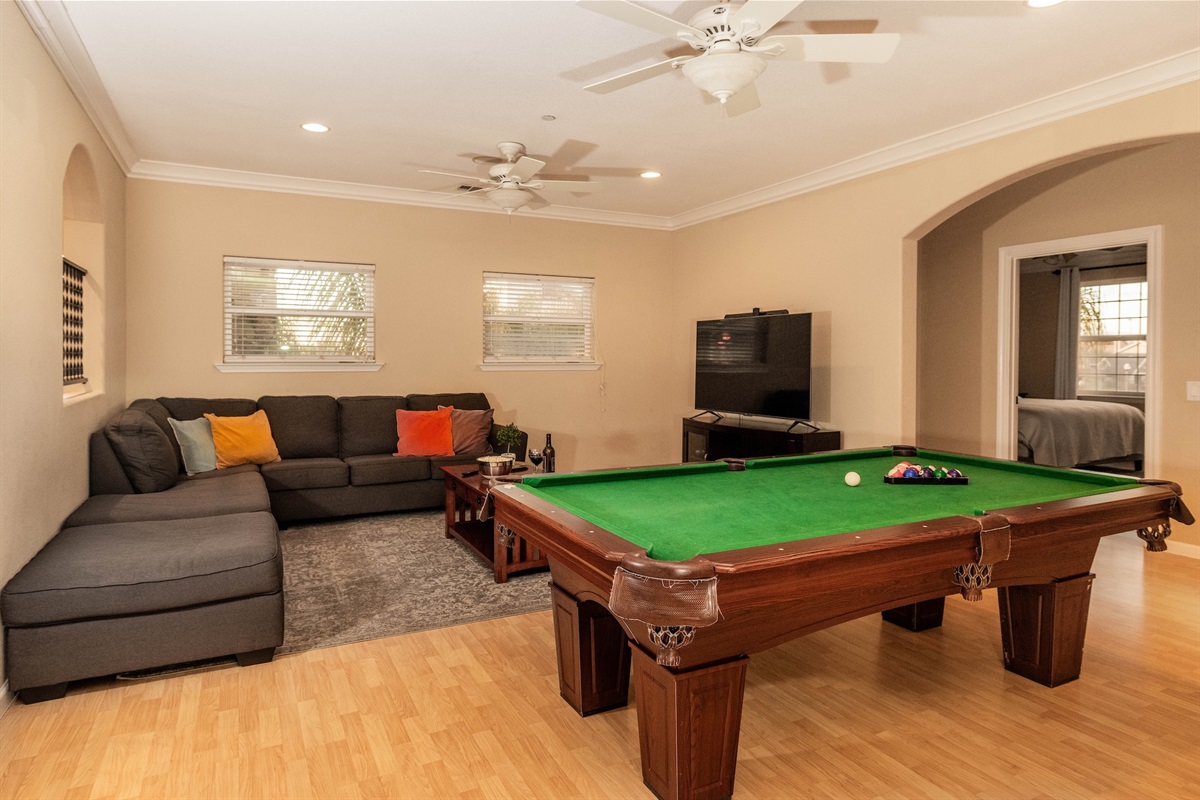 Our common areas are great for catching up with loved ones, hosting a gathering, or breaking out into work groups in a professional retreat. We are equipped with several Fire TVs throughout the house, set up for watching the big game, or relaxing after a day of wine tasting in the sun. Our upstairs den has a pool table and games for guests of all ages.